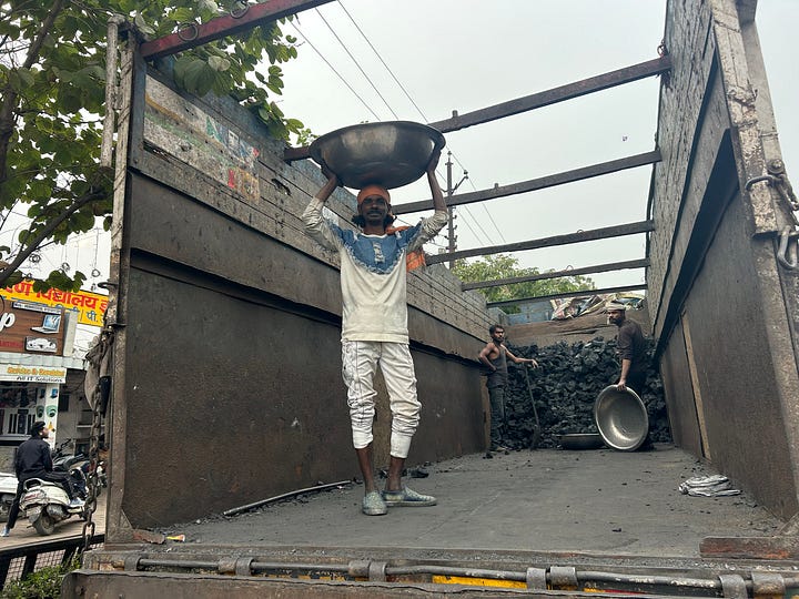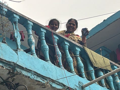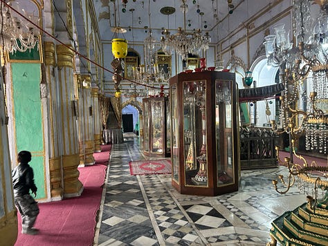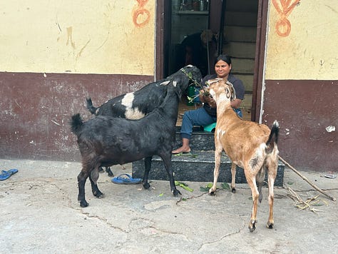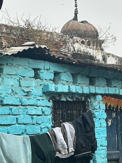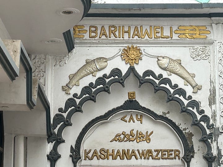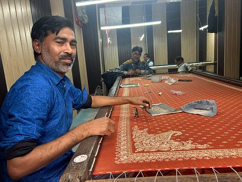 Over the doorway of a mosque - Lucknow is a quarter Shia Muslim - two fishes are embossed on the plaster - symbols of good fortune and fertility, and the crest of Lucknow. A young woman interrupts feeding leaves to three goats on her doorstep, to wave to us. May I tak your photograph? Of course! Men welcome us into their workshop, to watch them weave golden threads into a broad tapestry. It’s cold in the evenings, in the rainy season in Lucknow. It’s good to wear a jumper, a Kashmiri scarf, even a coat on the back seat of a tuk-tuk, buffeted by the wind.