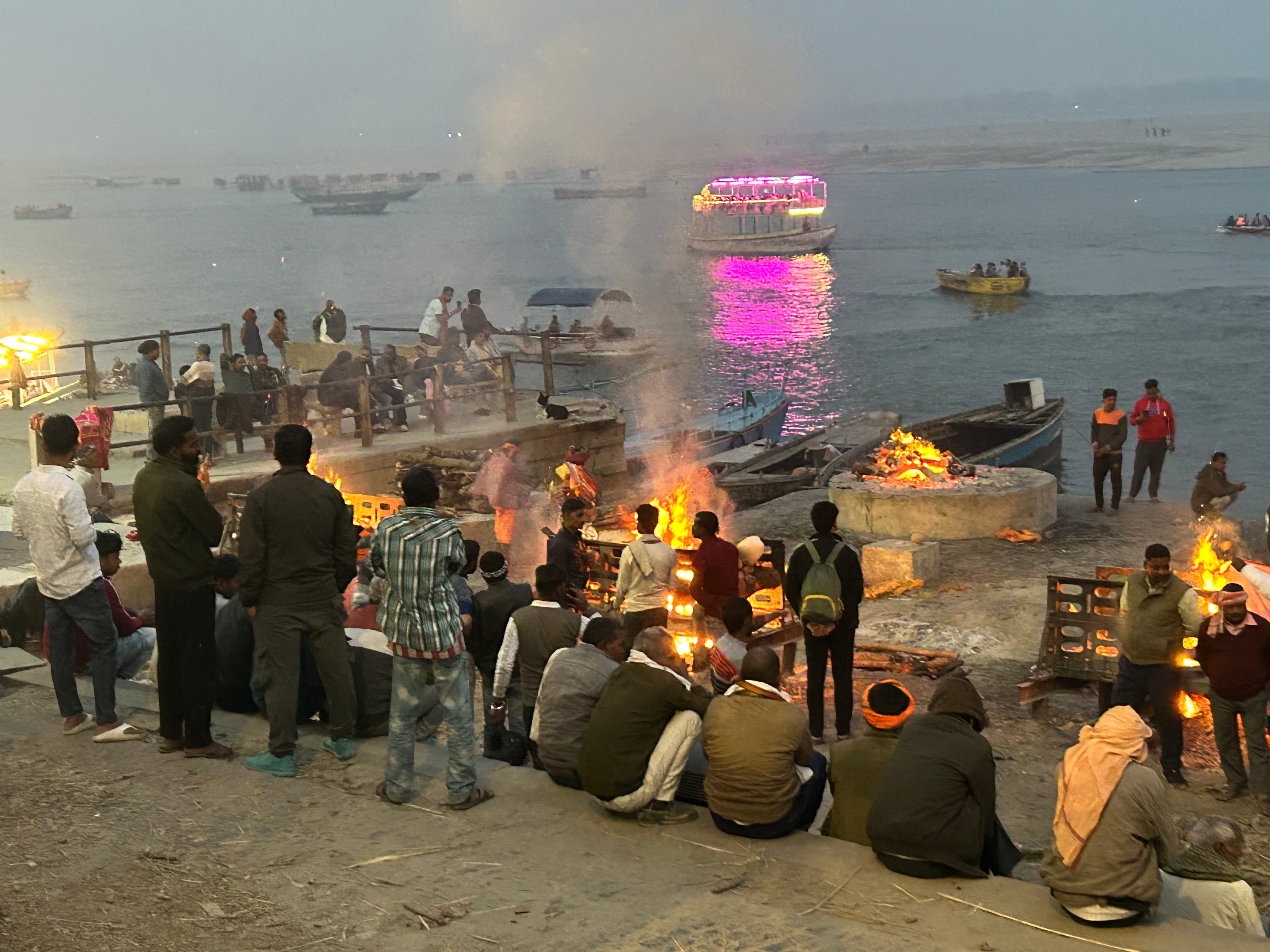 I copy the locals, shielding with my hands my eyes and face from the fire as I walk close by. The mango wood is dry and well stacked. It ignites immediately, sprinkled with ghee and sandalwood to make it burn faster, brighter, more brilliantly. It’s mercifully not easy to discern the body parts in the flames, so closely do they resemble the twisted wood.